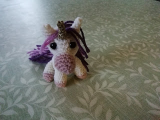 Och en virkad enhörning, svensk mönster av Janna Li Janke, (blogg Garngalning), under namnet 'Hästvärelser" . Det kan också bli stående, och med/utan vingar/hörn. Virkad med Rustas Ulla och virknål 3 mm.